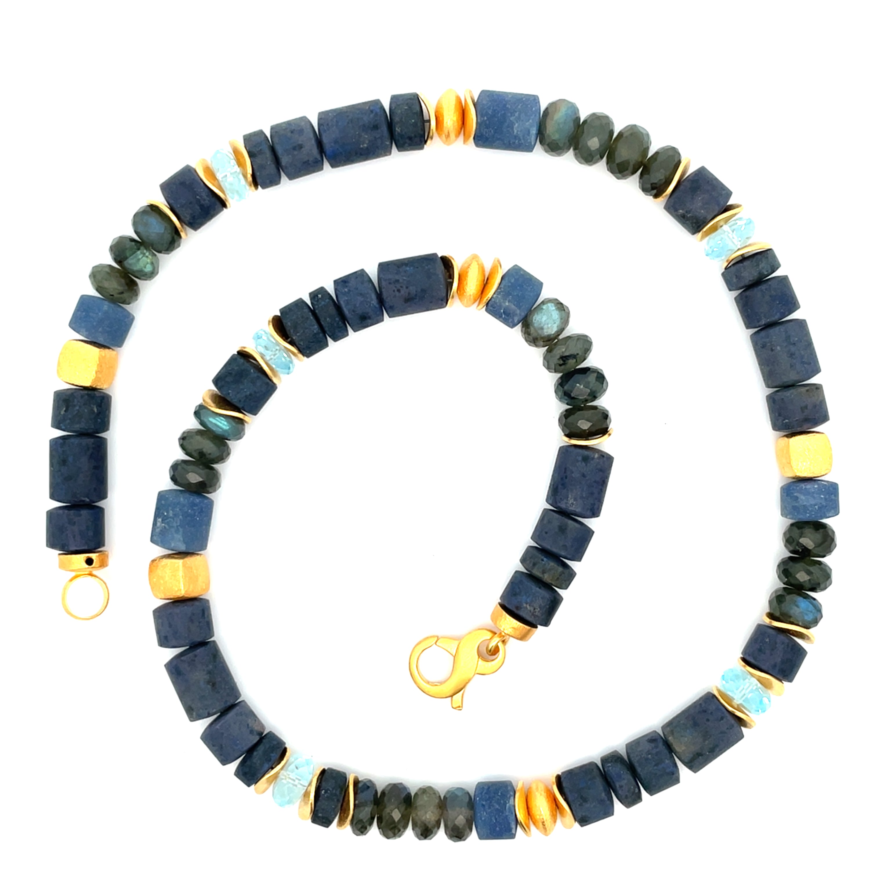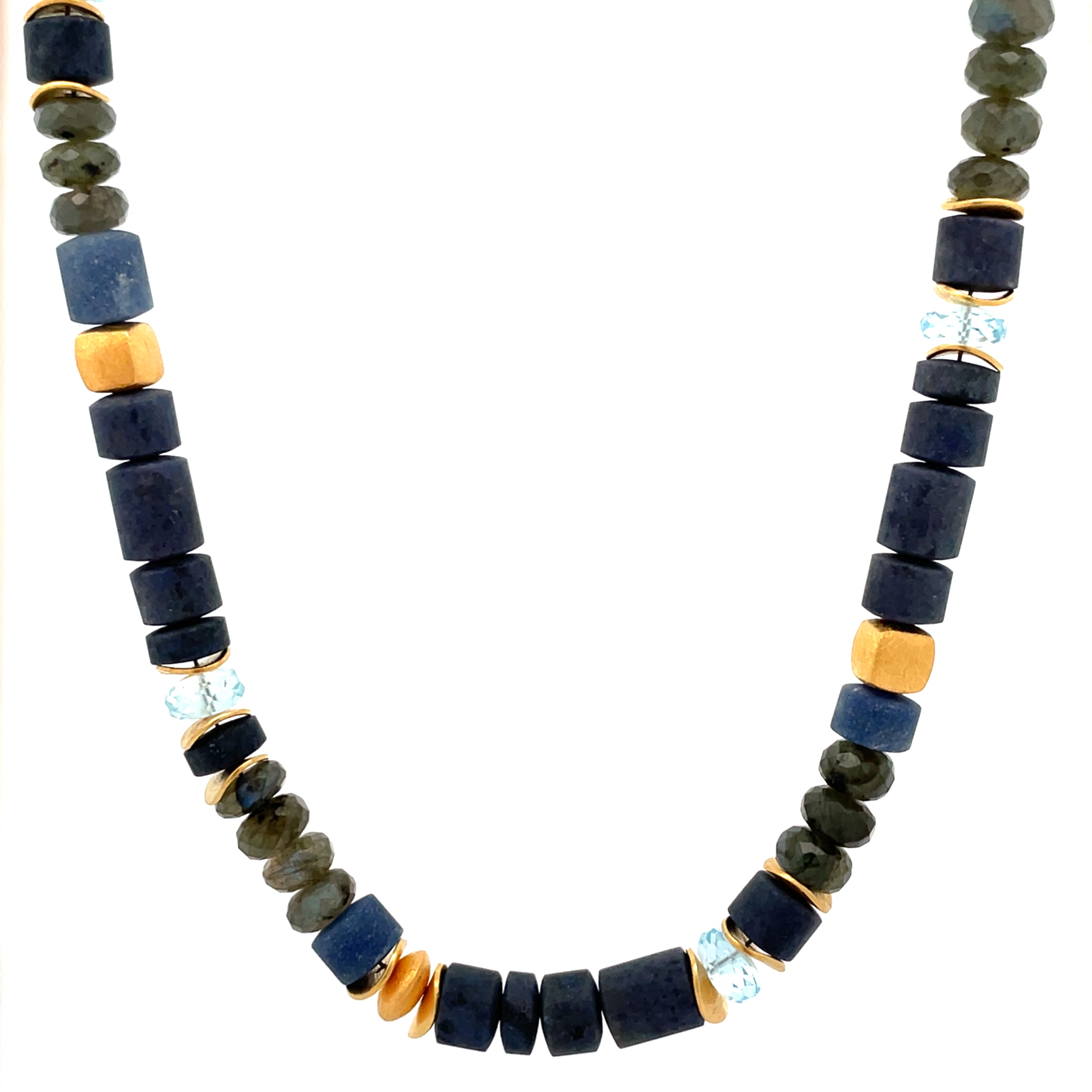 Die Blues Halskette vereint die tiefen Blautöne von Dumortiorit, Labradorit und Blauquarz Topas zu einem schönen Spiel aus Licht und Farbe. Gemeinsam entfalten die Steine eine beruhigende, zugleich edle Ausstrahlung - ein tolles Schmuckstück!