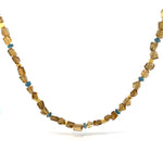 Unser Champagne Collier fällt auf durch seine unregelmäßige Machart - jeder Stein (Champagnerquarz) erzählt eine eigene Geschichte, gemeinsam angereiht ergibt diese ein ausgefallen, elegantes und vor allem zeitloses Schmuckstück. Bei den blauen Perlen handelt es sich um einen seltenen Topaz im Farbton London Blue, die goldenen Elemente, samt dem Verschluss bestehen aus vergoldetem Sterlingsilber.