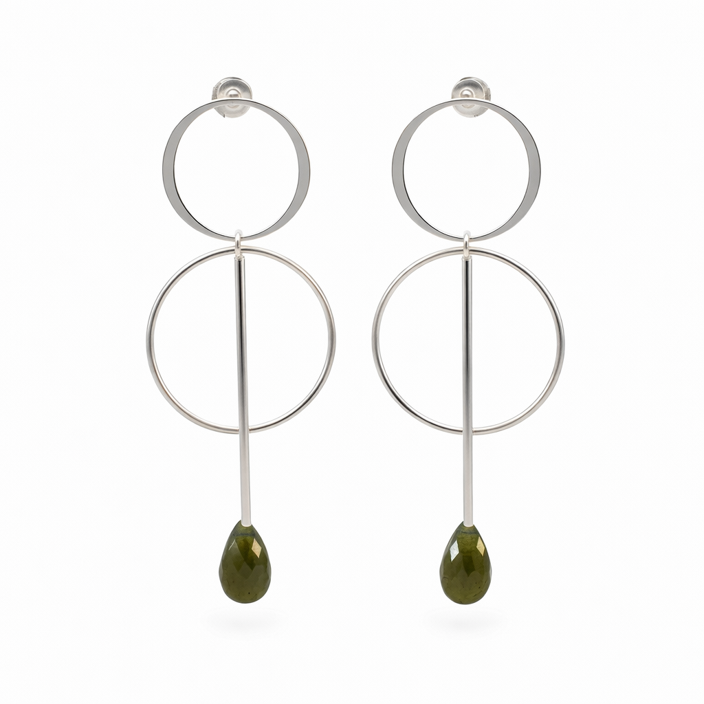 Am Ende des Designs sitzt ein fein geschlifener Edelstein, wahlweise Labradorit ider Bergkristall, der das klare Silberdesign elegant ergänzt. Die Kombination aus Geometrie, Bewegung und Edelstein macht diese Ohrringe zu einem ausdrucksstarken Schmuckstück - modern, stilvoll und zeitlos.