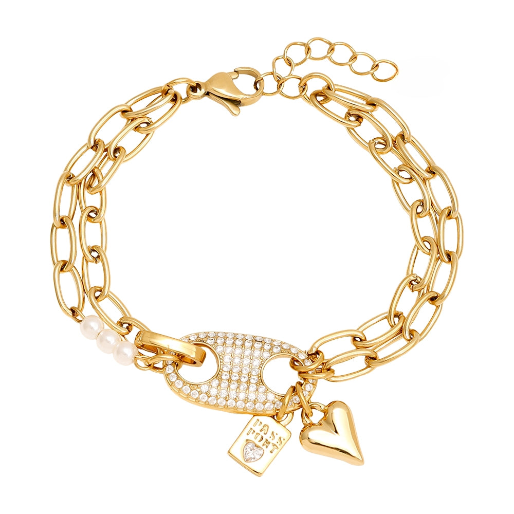 Unser Double Spark Armband überzeugt mit allem, was das Herz begehrt! Ein glitzerndes Center-Piece, kombiniert mit zwei kleinen Charms, getragen von zwei Ketten mit Perlen-Akzente.