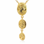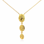 Diese elegante Halskette vereint klassischen Vintage-Charme mit moderner Raffinesse. Die drei ovalen Medaillons sind kunstvoll geprägt und vertikal angeordnet. Das detailreiche Reliefmotiv verleiht dem Schmuckstück eine besondere, zeitlose Ausstrahlung.
