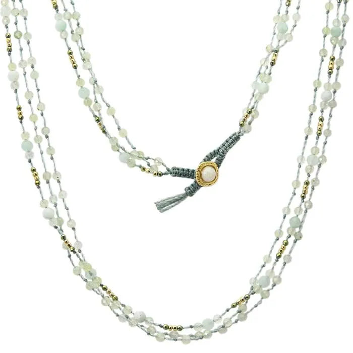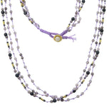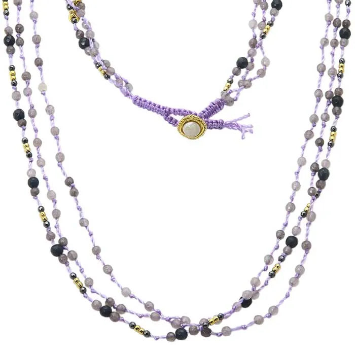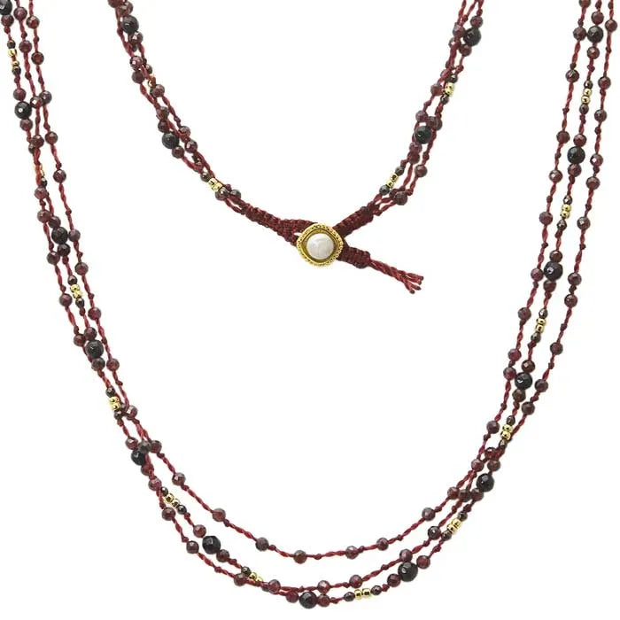 Diese dreireihige, liebevoll geknüpfte Edelsteinkette ist 85 cm lang und kann sowohl lang, als auch doppelt und kurz getragen werden.Erhältlich in Granat und grauem Achat.