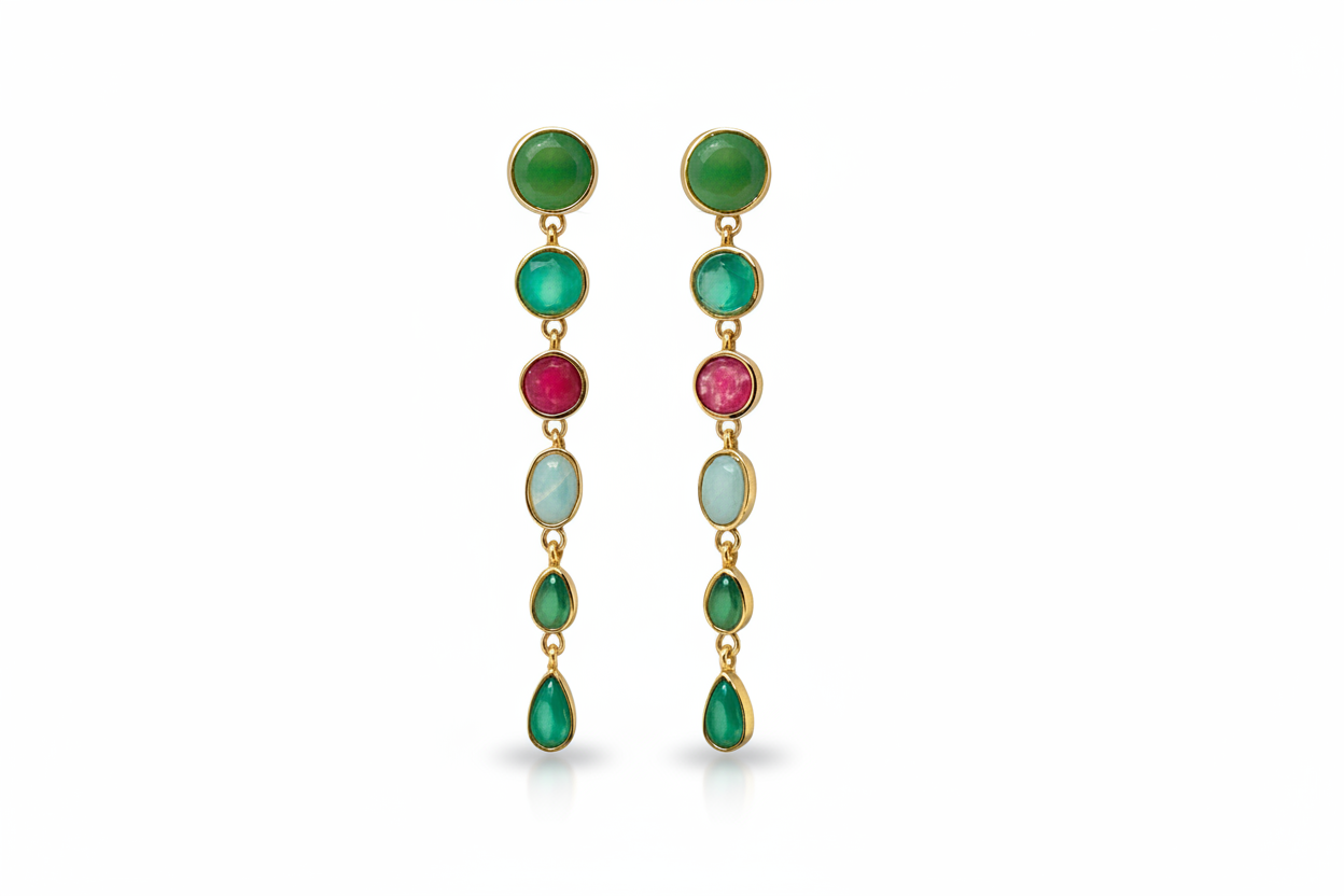 Diese filigranen Ohrringe vereinen ausgewählte Natursteine wie Achat, Amazonit und Prehnit zu einem harmonischen Farbspiel in sanften Grün- und Rosétönen.