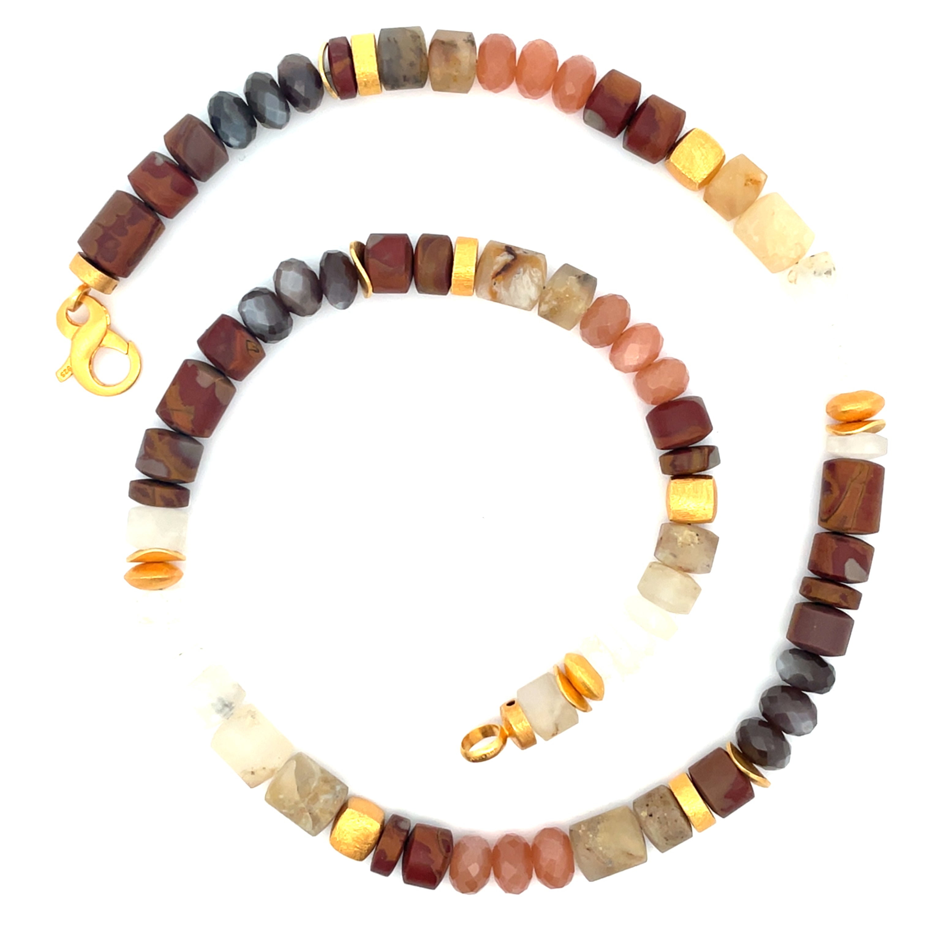 Die Jaspis Kette vereint die erdige Kraft des Jaspis, den sanften Schimmer des Mondsteins und die feinen Zeichnungen des Dendritenachats zu einem natürlichen, eleganten Schmuckstück. Die schönen Farbtöne in Kombinationen mit vergoldeten Silberakzenten verschmelzen zu einer ausgewogenen Komposition.