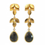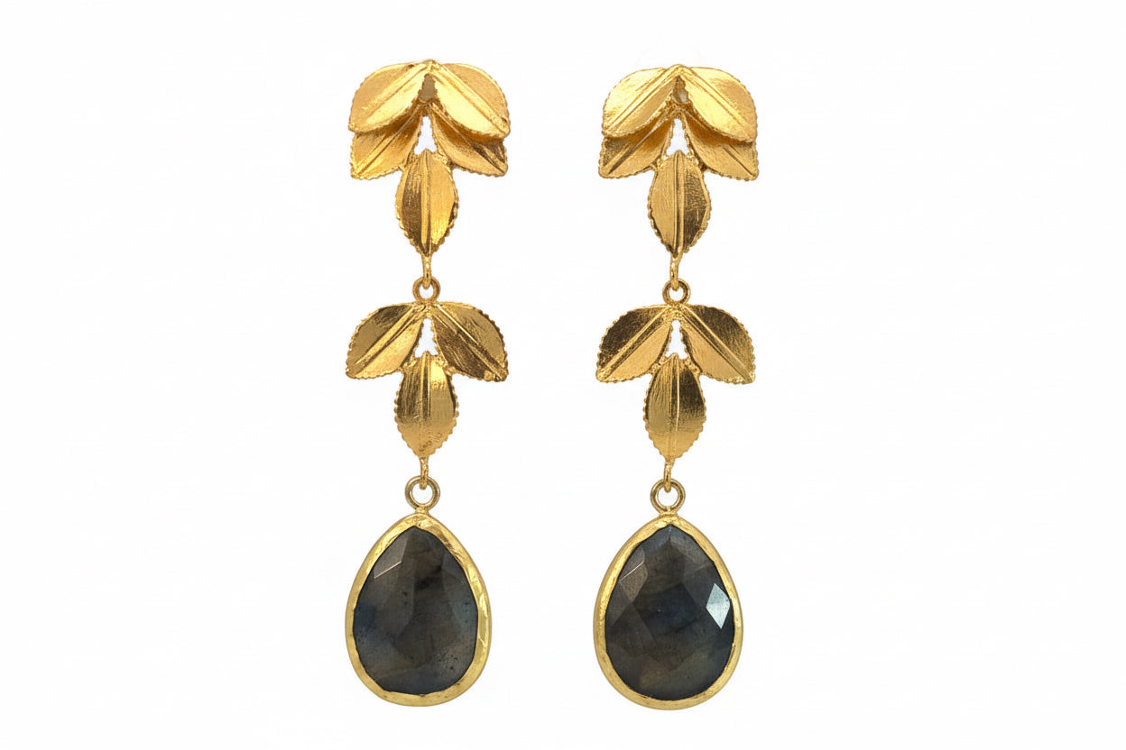 Diese eleganten Ohrringe verbinden natürliche Formen mit edlen Glanz. Die Blattelemente aus vergoldetem Messing verleihen dem Design eine organische, feminine Note. Abgerundet werden sie durch einen tropfenförmigen Labradorit, der je nach Lichteinfall geheimnisvoll schimmert und jedem Paar einen einzigartigen Charakter gibt.