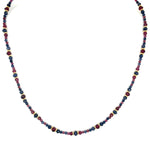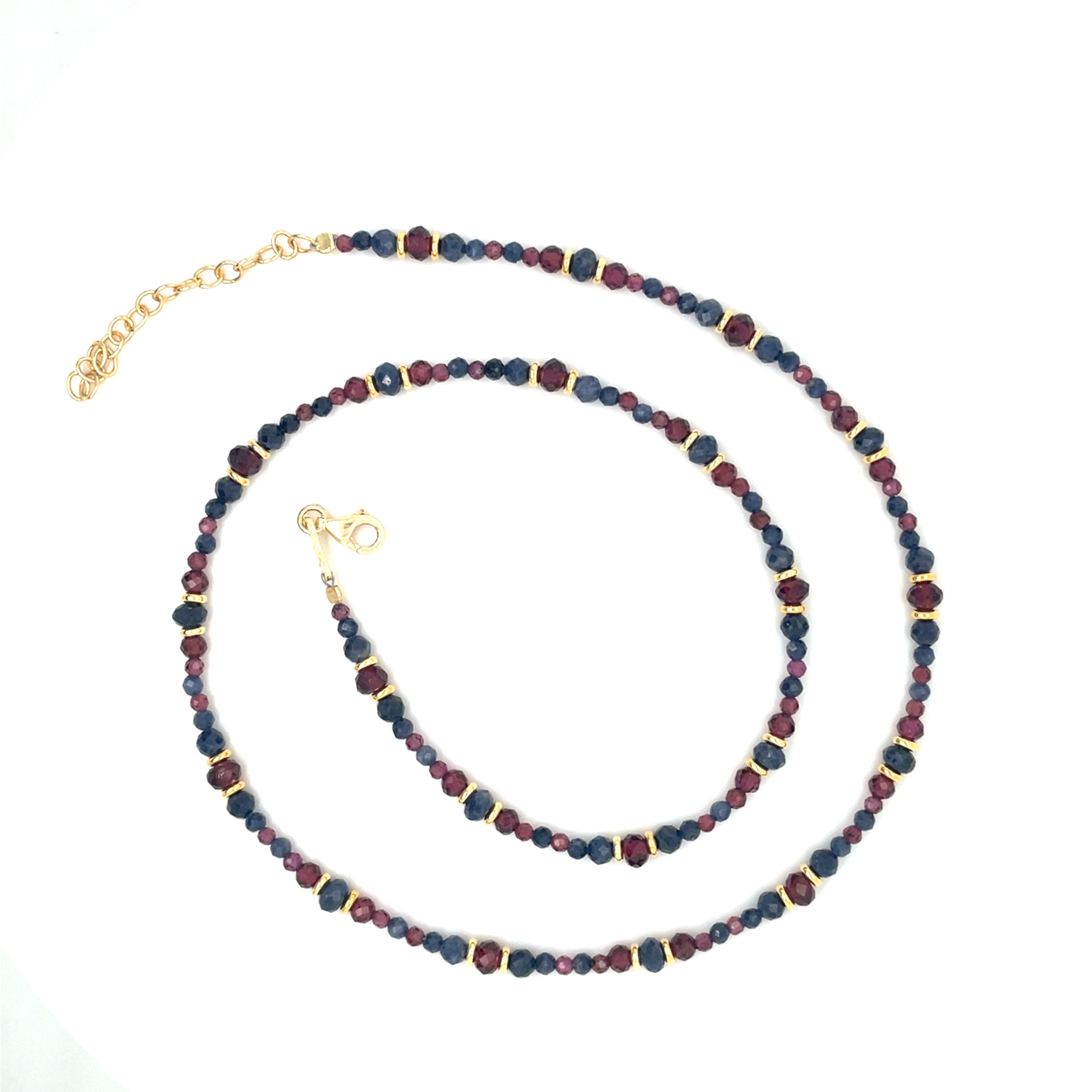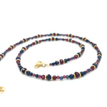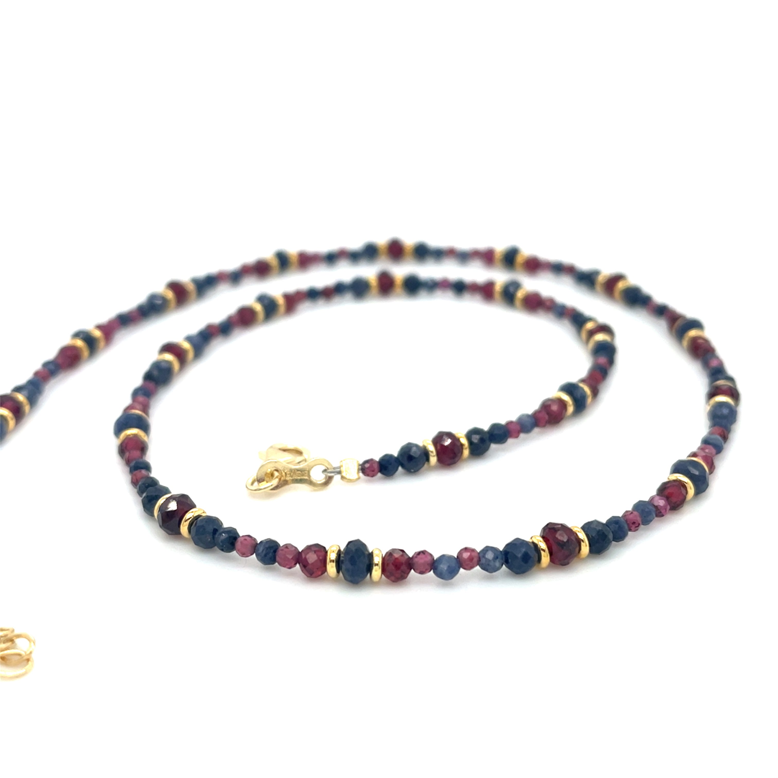 Die Lureva Halskette besteht aus den Natursteinen Granat und Saphir, welche dem Schmuckstück eine besondere Ausstrahlung verleihen. Die Steine entfalten bei jeder Bewegung ein faszinierendes Farbspiel.