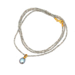 Die Perlabra Halskette aus Labradorit und Perle ist aus vergoldetem Sterlingsilber. Die grauen Facetten des Labradorits fangen das Licht auf einzigartiger Weise ein und harmonieren wunderbar mit dem sanften Glanz der grauen Perle. Zusammen symbolisieren sie Intuition, Weiblichkeit und innere Ruhe.