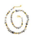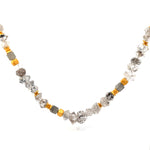 Unser Prana Collier beeindruckt durch seine unregelmäßig geschliffenen Herkimer Diamanten - einer einzigartigen Variante von Quarz, die bekannt ist für ihre unverwechselbare Klarheit und natürlichen Facetten, die den Edelstein wie echte Diamanten erscheinen lässt. Das Schmuckstück wurde in liebevoller Handarbeit in der Schweiz hergestellt. Die goldenen Elemente samt dem Verschluss bestehen aus vergoldetem Sterlingsilber.