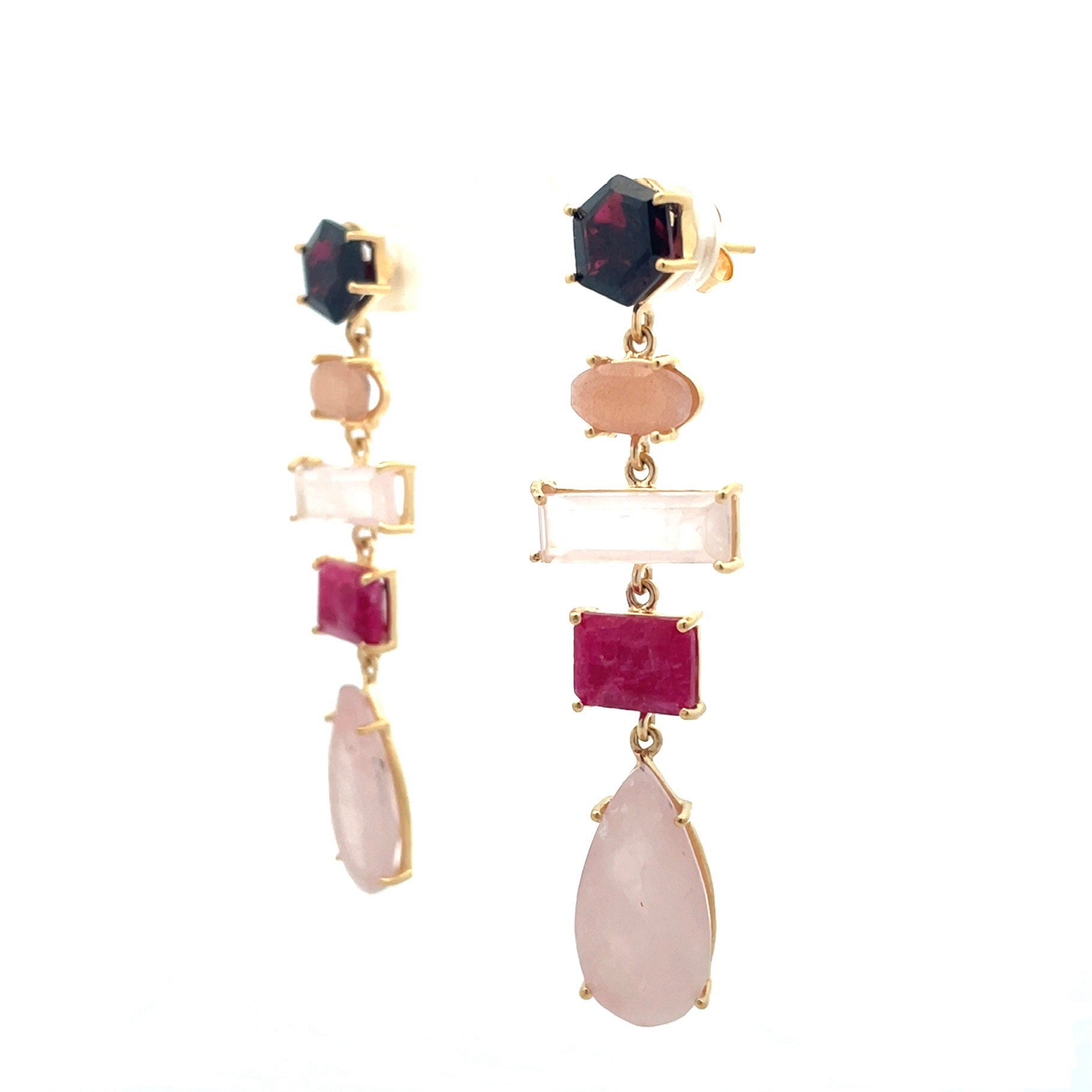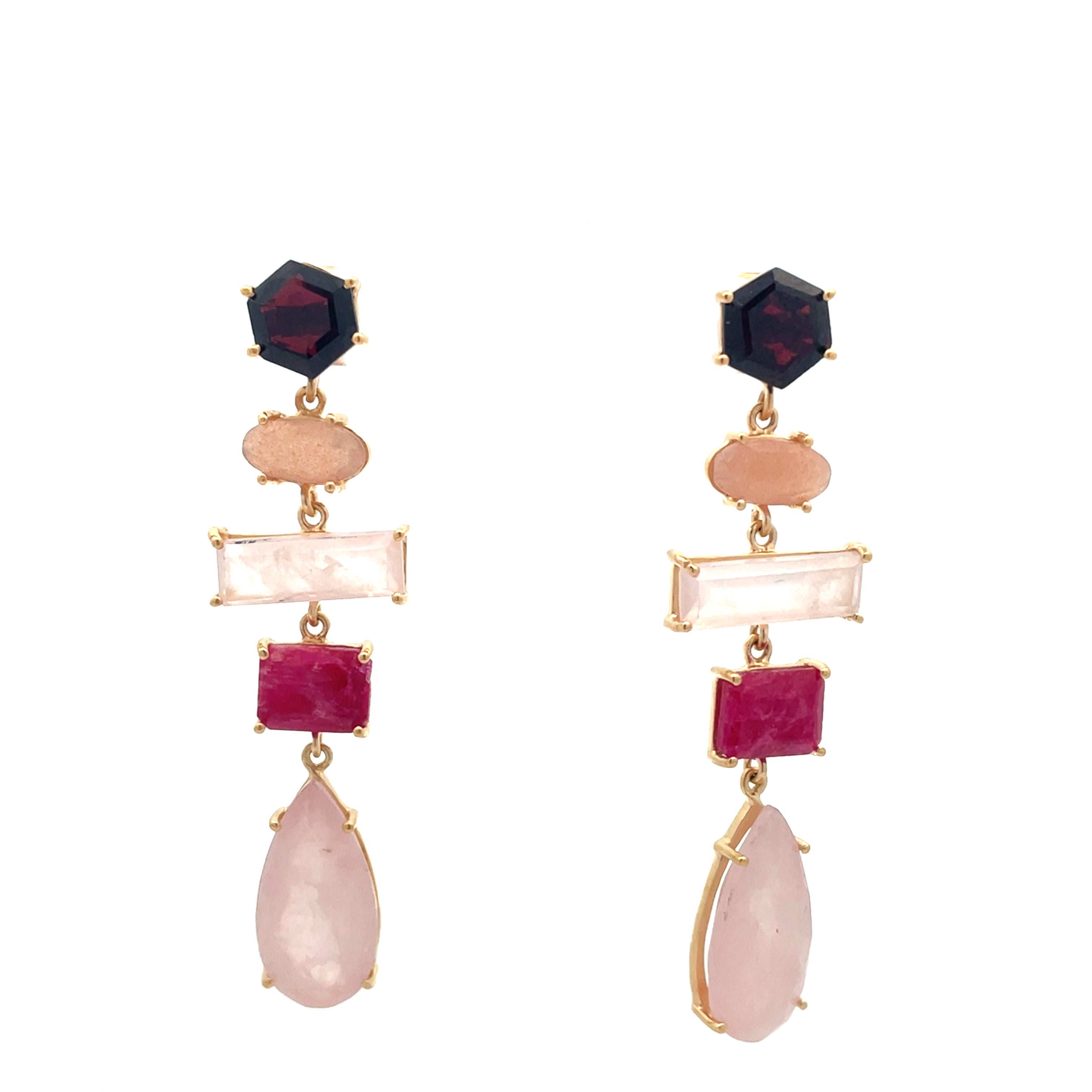 Der Rosy Rosa Ohrring ist handgefertigt aus vergoldetem Sterlingsilber. Die Kombination aus Granat, Korund (Ruby), Rosenquartz und Mondstein strahlen eine einzigartige Harmonie aus.