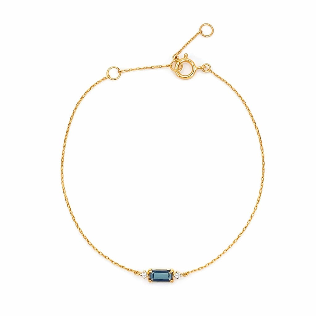 Fühl dich wie eine Prinzessin mit unserem Saina-Armband. 14 Karat Gold und ein zwei entzückende Diamanten. schmiegen sich hier an einen rechteckig geschliffenen Blau Topaz und zaubern einen fast schon royalen Akzent.