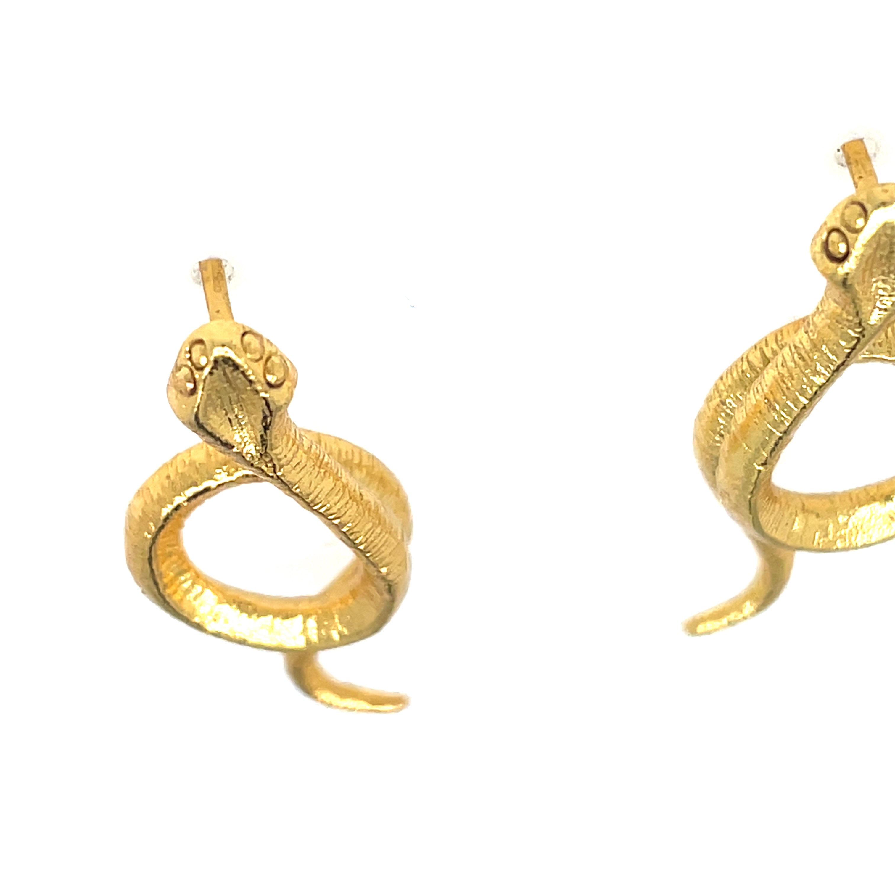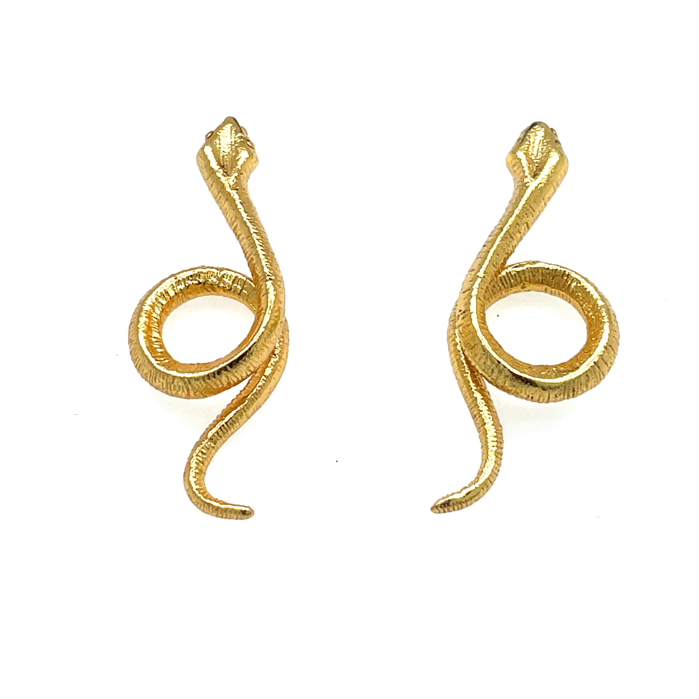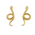 Diese Ohrringe in kunstvoller Schlangenform sind gefertigt aus vergoldetem Messing. Leicht und zugleich markant sind sie das ideale Schmuckstück für alle, die ihren Look mit einem Hauch Mystik vollenden möchten.