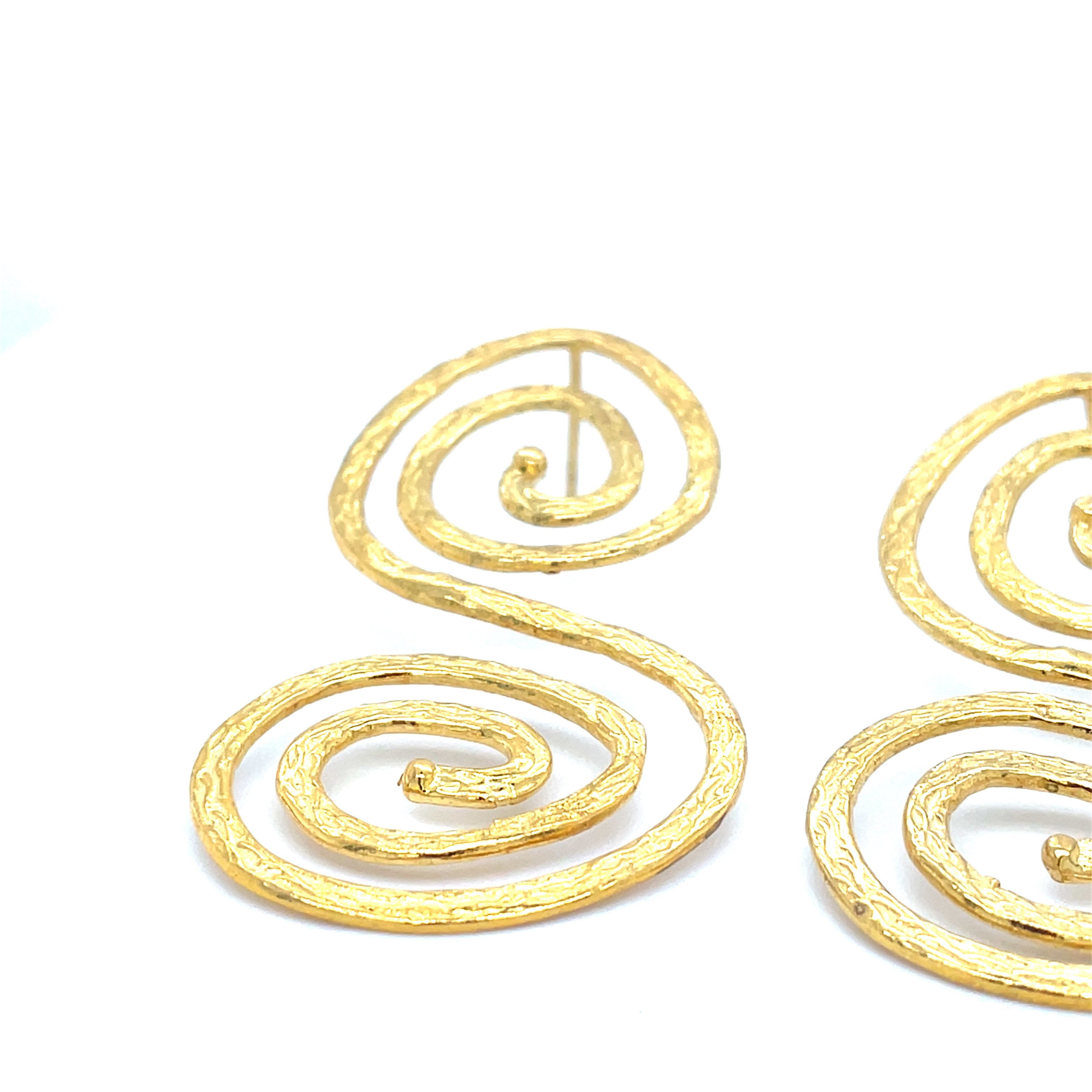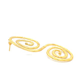 Diese kunstvollen Ohrringe aus vergoldetem Messing vereinen Ausdruckskraft und Stil in einem außergewöhnlichen Design. Die doppelte Spiralform zieht mit ihrer organischen Form alle Blicke auf sich. Die Oberflächenstruktur schimmert besonders lebendig im Licht.
