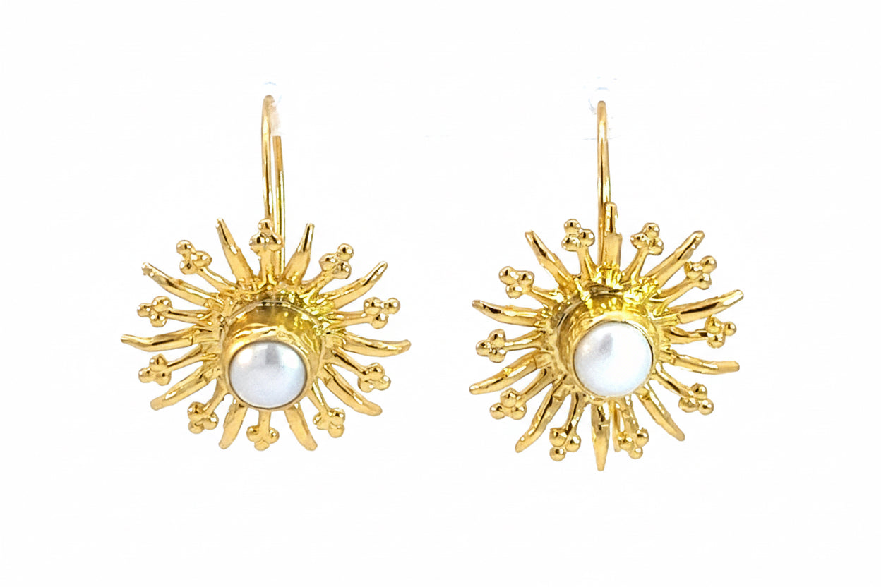 Diese eleganten Ohrringe vereinen zeitlose Symbolik mit feinen Details. Gefertigt aus hochwertigem Messing  und edel vergoldet, zeigen sie ein Sonnenmuster, das für Wärme, Energie und Lebensfreunde steht. Im Zentrum jeder Sonne sitzt eine schimmernde Süßwasserperle, die dem Design eine feminine und edle Note verleiht.