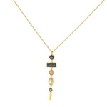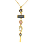 Die Symphonia Halskette wurde aus vergoldetem Silber gefertigt und zeigt eine elegante Abfolge von Steinen in verschiedenen Farbnuancen: Rauchquarz, Labradorit und Prehnit.