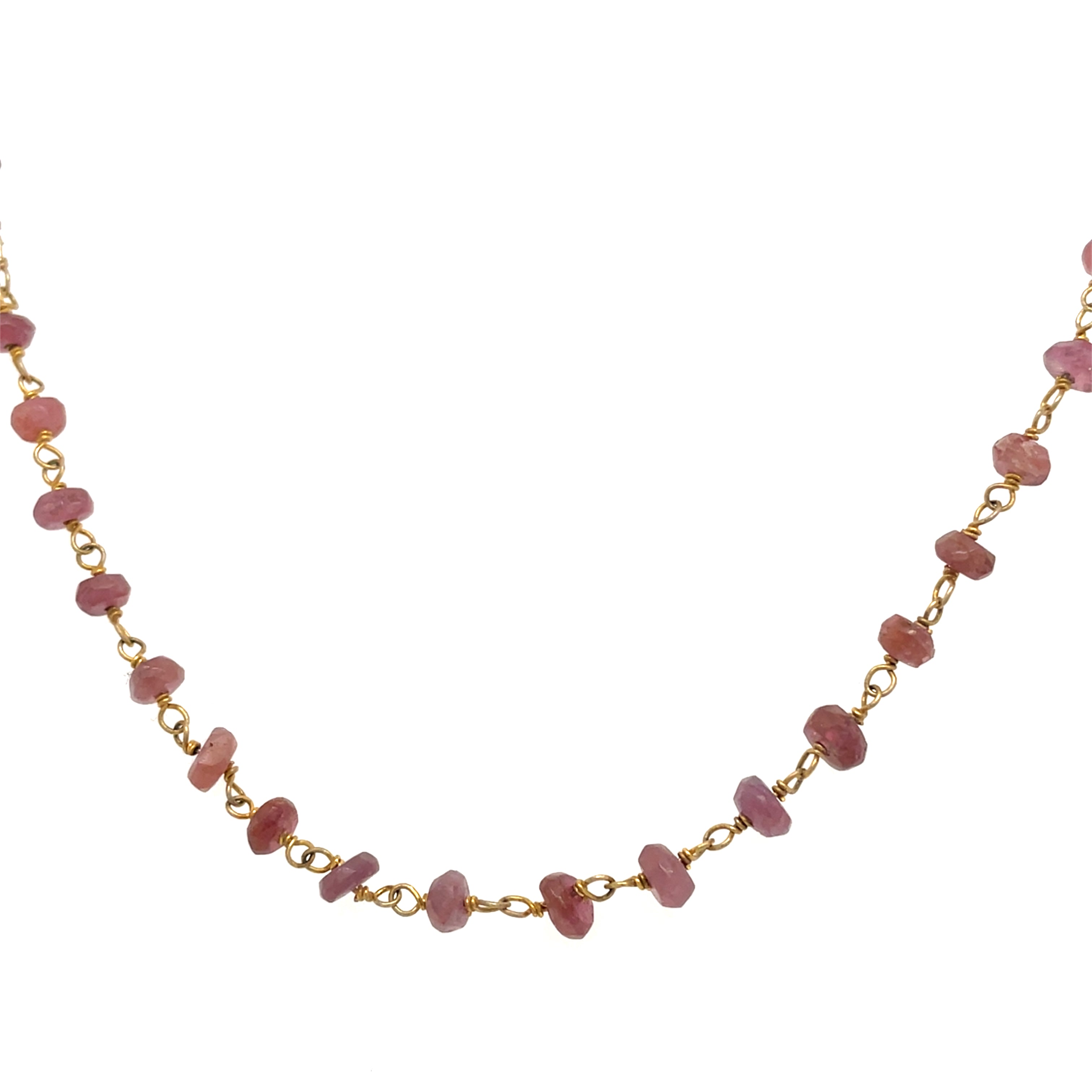 Diese handgefertigte Halskette begeistert mit feinen, rosa Turmalin-Steinen und ist aus vergoldetem 925 Sterlingsilber. Die zarten Rosétöne verleihen dem Schmuckstück eine feminine und moderne Ausstrahlung. Durch die Struktur der Edelsteine erhält die Kette ihren eigenen Charakter - ein stilvolles Accessoire, das sich perfekt zum Layern oder als einzelner Blickfang tragen lässt.