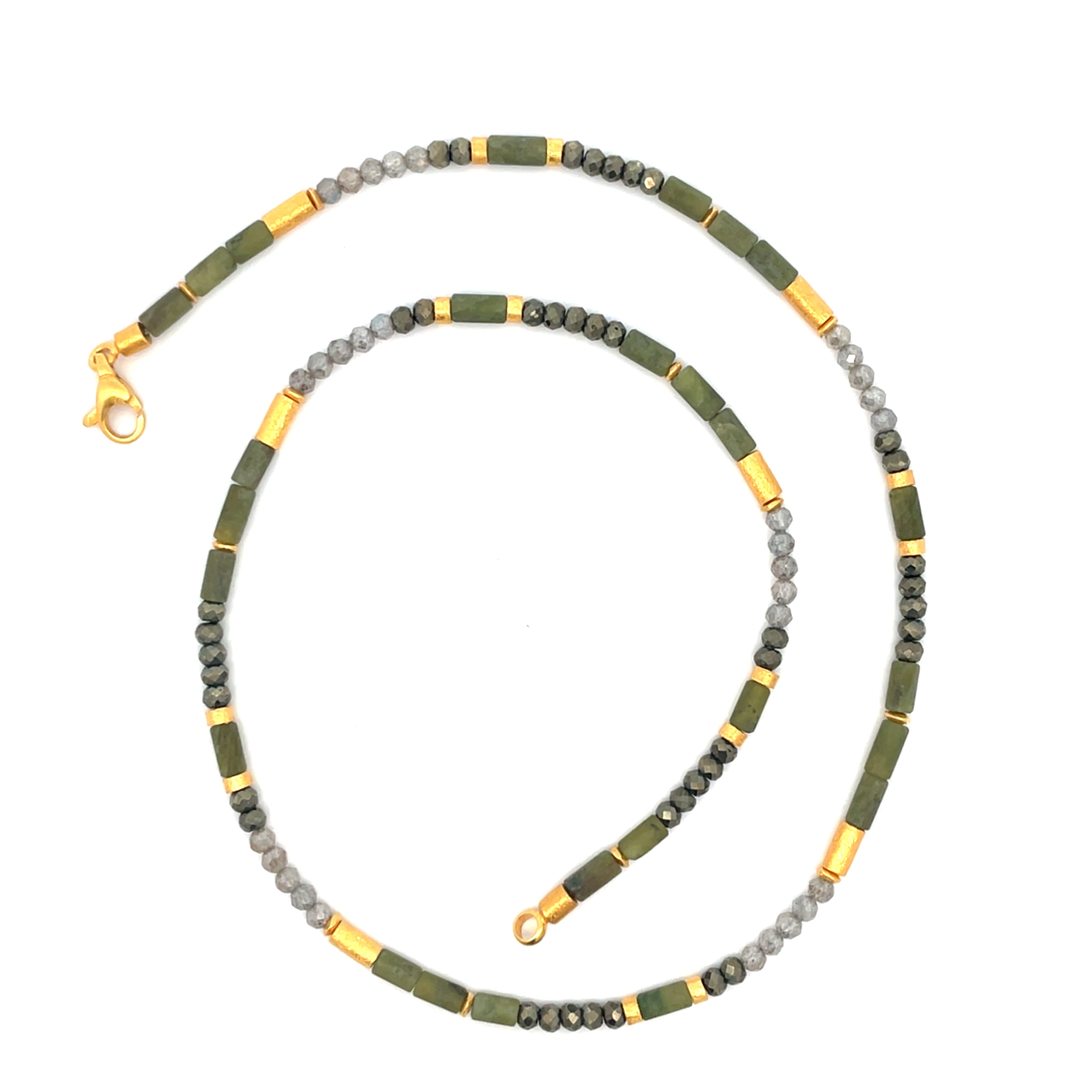 Diese handgefertigte Kette vereint die funkelnde Wärme von Vesuvian Pyrit mit dem geheimnisvollen Schimmer des Labradors, ergänzt durch vergoldete Silberelemente. Der Pyrit strahlt Energie und Lebendigkeit aus, während der Labradorit Tiefe und Magie verleiht. Gemeinsam entsteht ein Schmuckstück voller Ausdruckskraft und Harmonie.